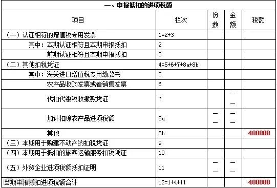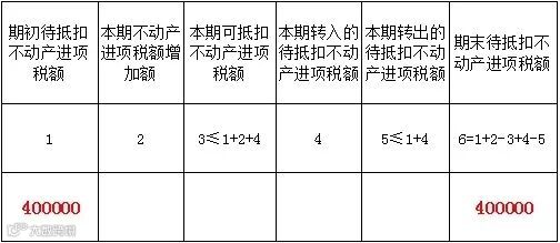 1.2019年3月税款所属期,该纳税人《增值税纳税申报表附列资料(五)》第6栏“期末待抵扣不动产进项税额”的期末余额为400000元。见下图: