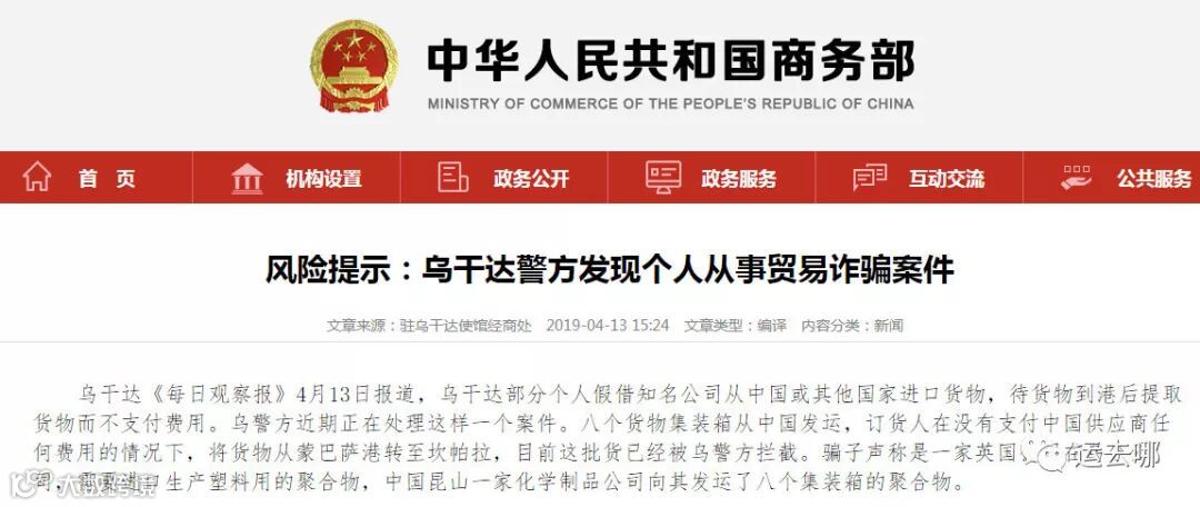 据乌干达《每日观察报》报道,乌干达部分个人假借知名公司从中国或其他国家进口货物,待货物到港后提取货物而不支付费用。骗子声称是一家英国公司在乌分公司,需要进口生产塑料用的聚合物,中国昆山一家化学制品公司向其发运了八个集装箱的聚合物。