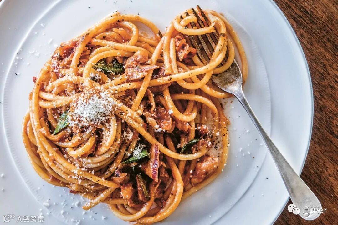 Spaghetti all’amatriciana(意大利spaghetti面,羊用番茄、洋葱、辣椒、Pecorino Romano DOP奶酪和guanciale制成的酱拌匀)