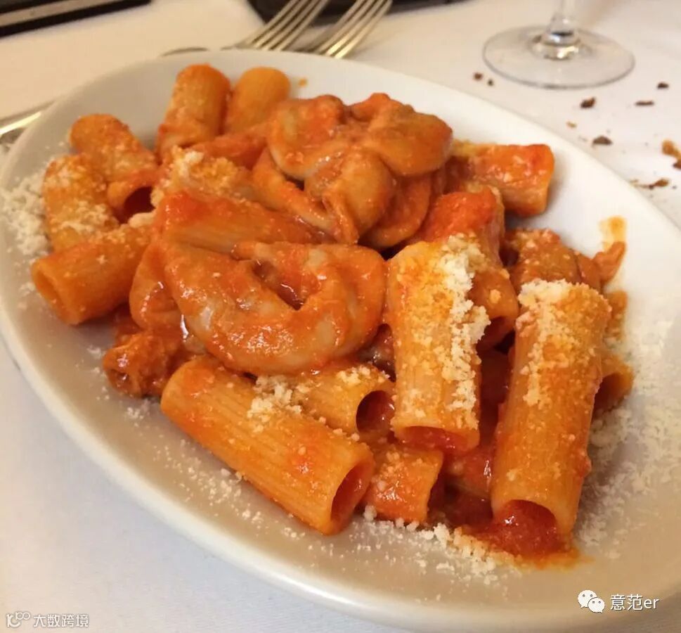 Rigatoni con la pajata(意大利rigatoni面,上面配有Pecorino Romano DOP 奶酪、火腿脂肪、肉豆蔻、丁香、白葡萄酒、番茄和 pajata(小牛、羊或羔羊的胃)