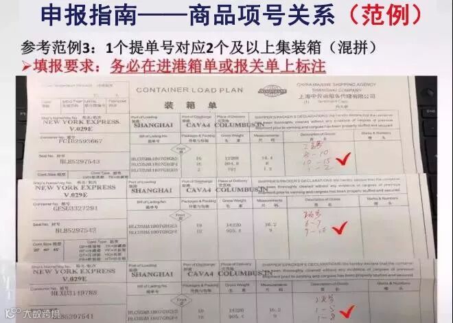 4、集装箱商品项号关系:需填报每个集装箱对应的商品项号,即需明确每个集装箱内分别装有哪些货物