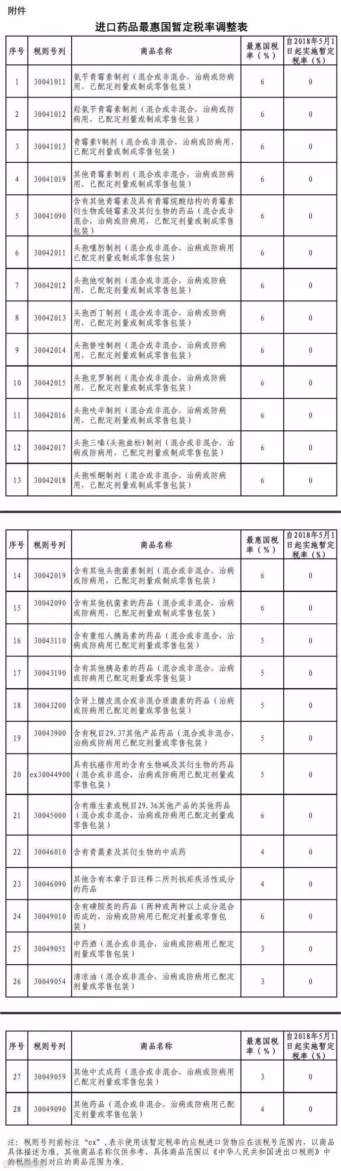 根据《中华人民共和国进出口关税条例》相关规定,为减轻广大患者特别是癌症患者药费负担并有更多用药选择,自2018年5月1日起,以暂定税率方式将包括抗癌药在内的所有普通药品、具有抗癌作用的生物碱类药品及有实际进口的中成药进口关税降为零,具体税目及税率调整情况见附件。