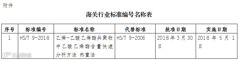 3、实施海关行业标准——《乙烯-乙酸乙烯酯共聚物中乙酸乙烯酯含量快速分析方法 热重法》。