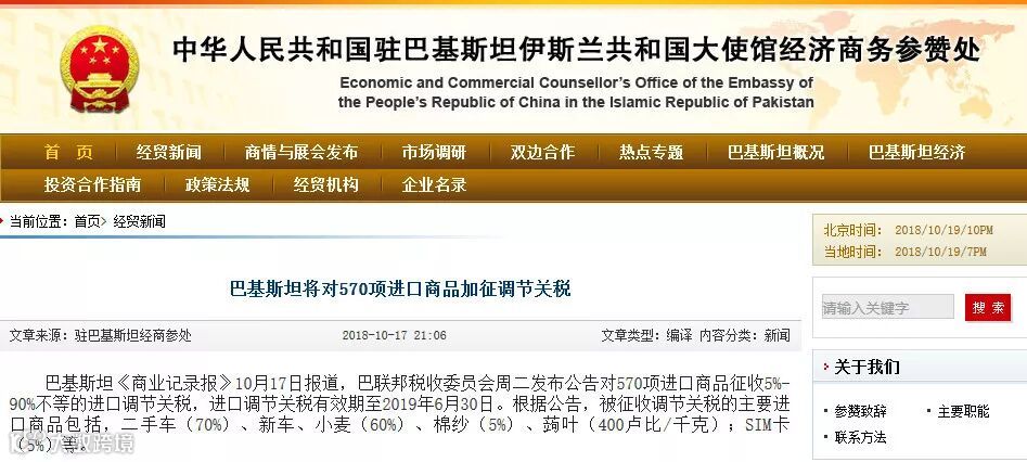 据巴基斯坦《商业记录报》10月17日报道,巴联邦税收委员会10月16日发布公告,对570项进口商品征收5%-90%不等的进口调节关税,进口调节关税有效期至2019年6月30日。