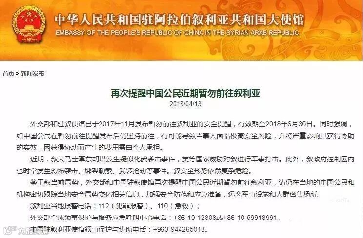 4月13日,中国驻叙利亚使馆再次发布提醒:外交部和驻叙使馆已于2017年11月发布暂勿前往叙利亚的安全提醒,有效期至2018年6月30日。同时强调,如中国公民在暂勿前往提醒发布后仍坚持前往,有可能导致当事人面临极高安全风险,并将严重影响其获得协助的实效,因获得协助而产生的费用需由个人承担。