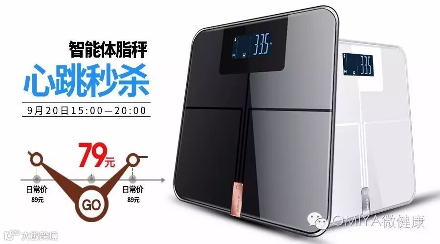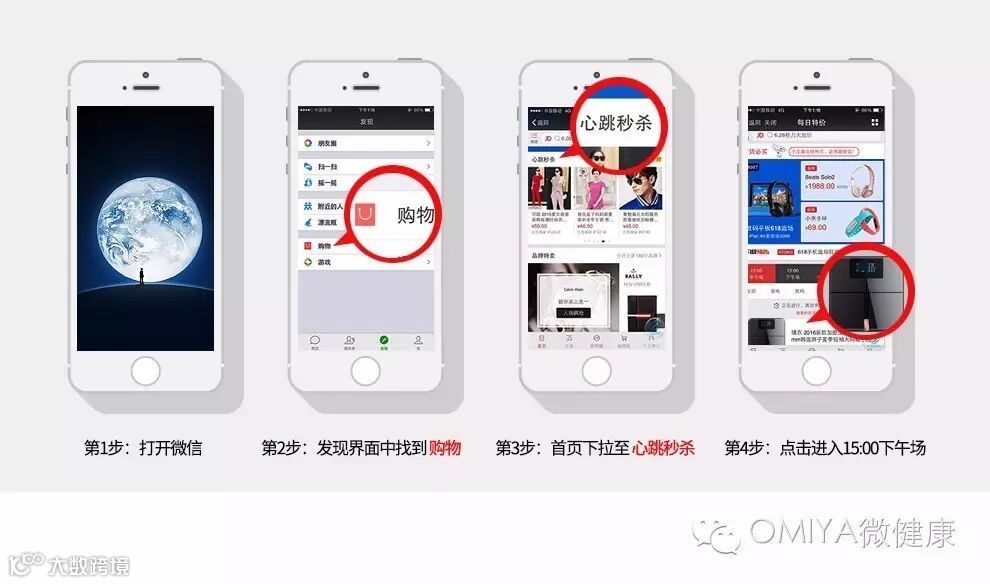 打开微信→点击“发现”→“购物”→进入京东购物页面→下拉至“心跳秒杀”→点击右侧时间→找到15:00→下拉找到OMIYA体重秤进行购买。