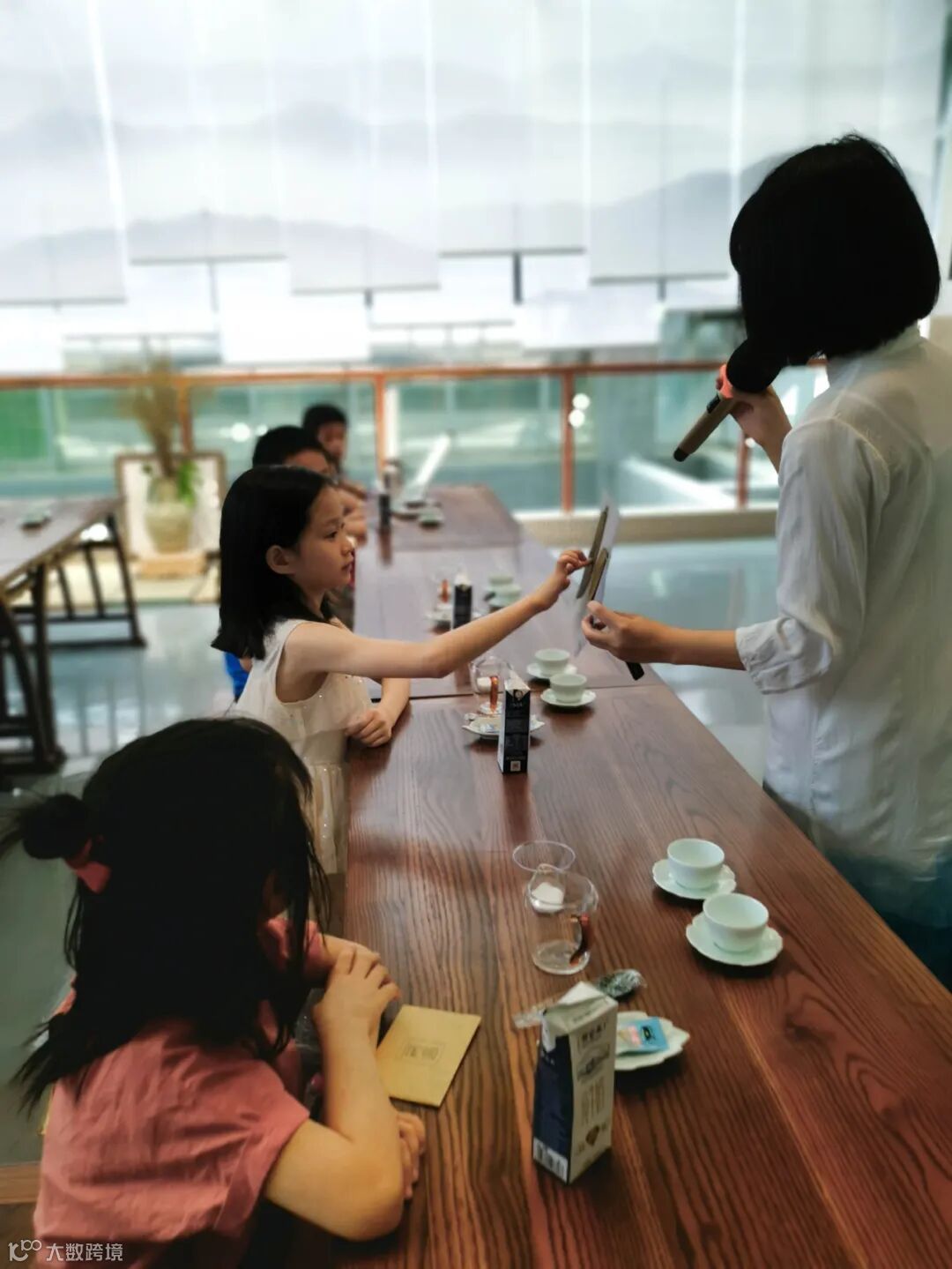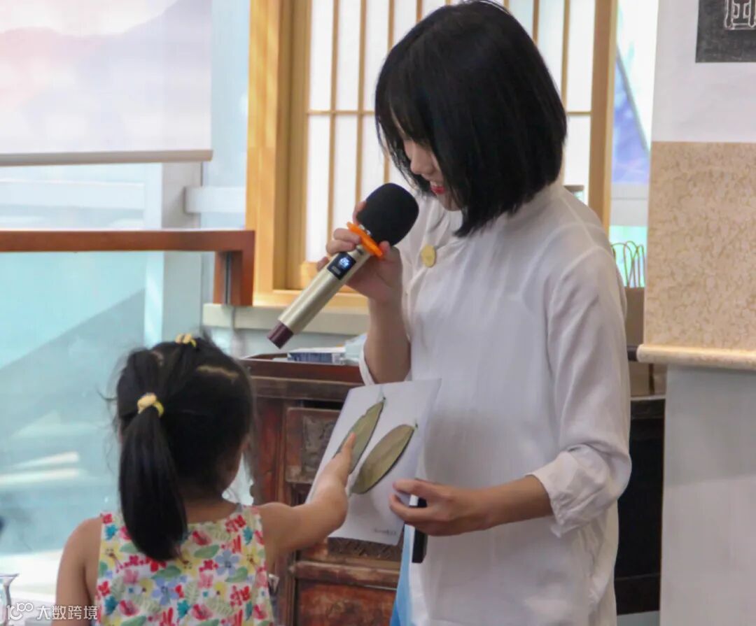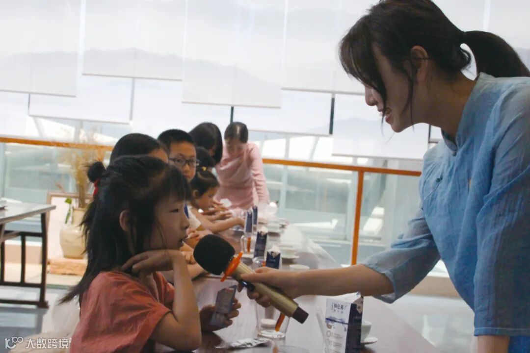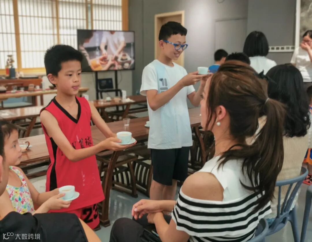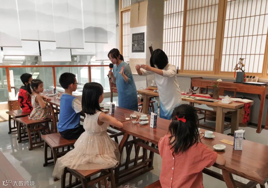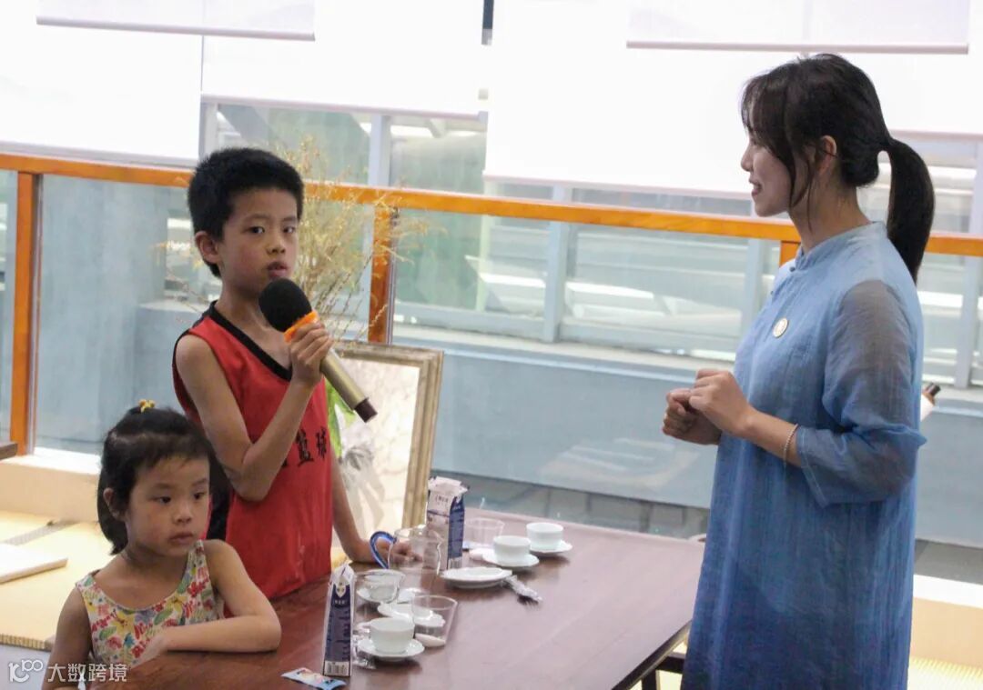 书房老师给孩子讲解了茶文化、茶礼仪之后,带小朋友进行体验。首先是一对一的引导方式,场面很欢乐,有些初次体验的小朋友纷纷表示对这一项新事物的喜爱,“这个奶茶好好喝,我不能浪费。”、“我记住了老师给我们分享的宝墩书房瓦猫精神——