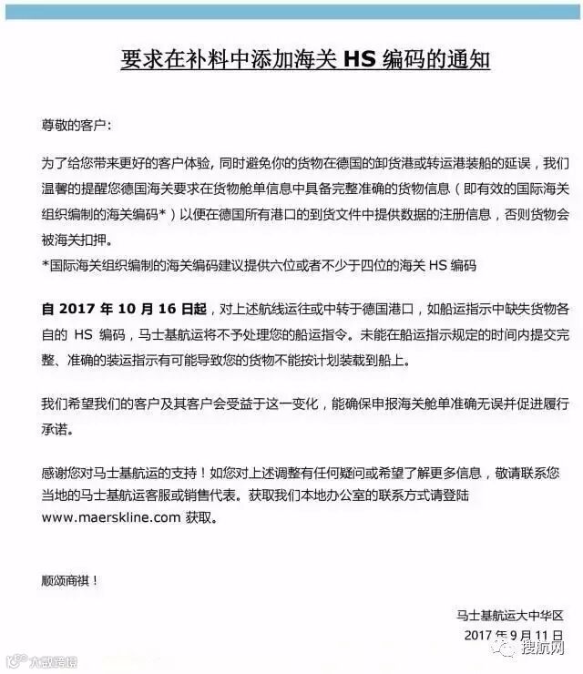 马士基已发布相关通知,规定从10月16日起,要求出口到德国或者中转于德国港口的货物必须提供货物各自的HS编码。如未能提供,将不予处理货主的船运指令。