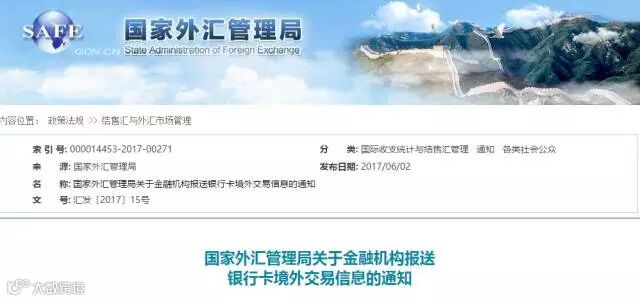 中国外汇局在北京时间6月2日,发布新规定:2017年9月1日起,中国境内发行的各类银行卡,如果在境外消费刷卡超过人民币1000元,发卡行要上报。
