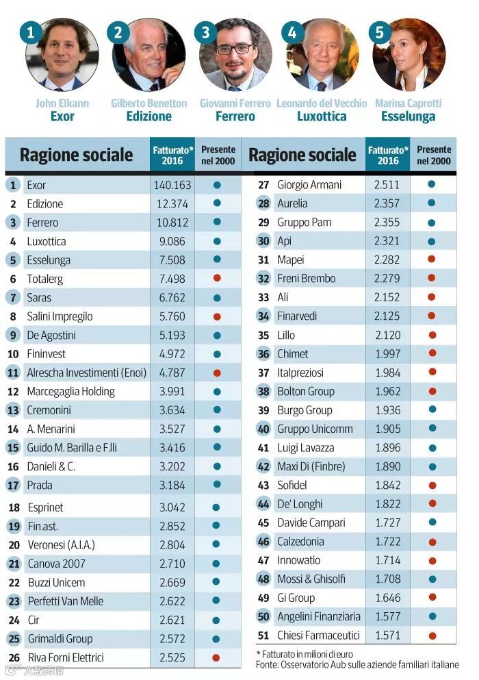 与2000年的家族企业排行榜相比,在16年的时间里共有18个新企业进入到«50+1»意大利企业排行榜之中,正如意大利博科尼大学的一份研究所示。