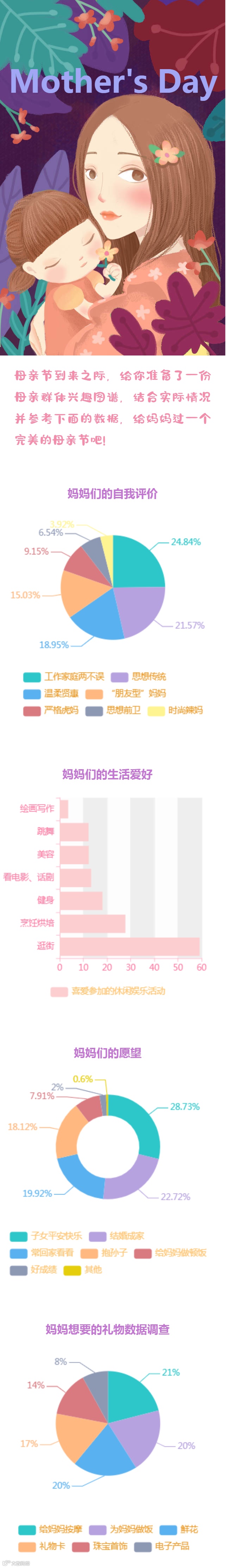 看完上面的数据,不难发现,妈妈的愿望和想要的礼物都与自己有关。那这个母亲节,给妈妈准备一份小礼物,留出时间陪妈妈吃吃饭,在午后的阳光与微风里陪妈妈喝喝茶、聊聊小时候。不要忘记告诉妈妈,你是真的很爱很爱她。