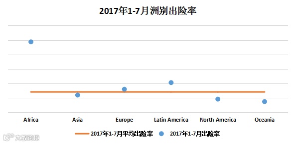 从全球来看,1-7月,欧洲报损总额及案件数量均居于全球首位,占比均在30%左右;从出险率情况来看,非洲延续了2016年风险态势,风险水平依然居于全球首位,其次为拉丁美洲。