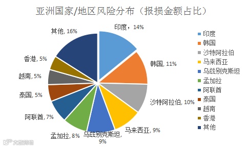 2017年1-7月,亚洲报损案件数量与欧洲持平,报损金额仅次于欧洲。其中,印度、孟加拉、香港、阿联酋、越南、韩国及沙特阿拉伯等国的报损案件数量及金额均位列前十。从报损金额同比增幅来看,沙特阿拉伯、马来西亚、乌兹别克斯坦、泰国及越南等国较去年同期呈现不同程度的增幅。从出险率来看,出口较多的亚洲国别中,泰国、孟加拉、沙特阿拉伯、马来西亚及以色列等国别风险水平显著高于全球平均水平。