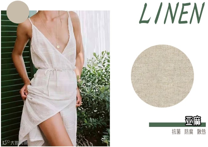 有助于保持人体电解质平衡。研究表明,亚麻服装可以使人体排汗量比穿着棉类服装减少1.5倍。