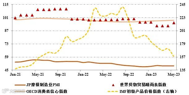 2023年以来,世界经济复苏乏力情况持续。发达经济体加息对经济增长造成的负面作用持续显现,银行业动荡、顽固性通胀等不确定因素增加经济衰退风险,居民、企业等各部门资产负债表受损,二季度以来需求侧压力未有缓解。经合组织(OECD)消费者信心指数为98.2,回升至15个月以来的最高水平,但仍然连续21个月位于收缩区间。从供给侧看,全球制造业景气连续9个月处于收缩区间,J.P. Morgan制造业采购经理指数(PMI)3~5月一直维持在49.6,其中新出口订单指数仅47.3,降至9个月以来新低;在有记录的发达国家中,仅有日本5月PMI位于扩张区间。5月发布的WTO货物贸易晴雨表指数为95.6,较一季度小幅回升3.4个百分点,仍低于100趋势水平。全球通胀水平保持高位回落态势,5月IMF初级商品价格指数为158.3,较上年同期大幅回落67.8个百分点,基本回归至2021年同期水平。