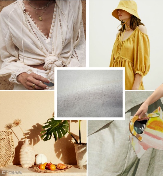 2021春夏棉麻面料比起花型的关注度更加关注面料的肌理效果。色彩上清浅色增多,黑暗色系减少,更加贴合度假主题的欢快色调。