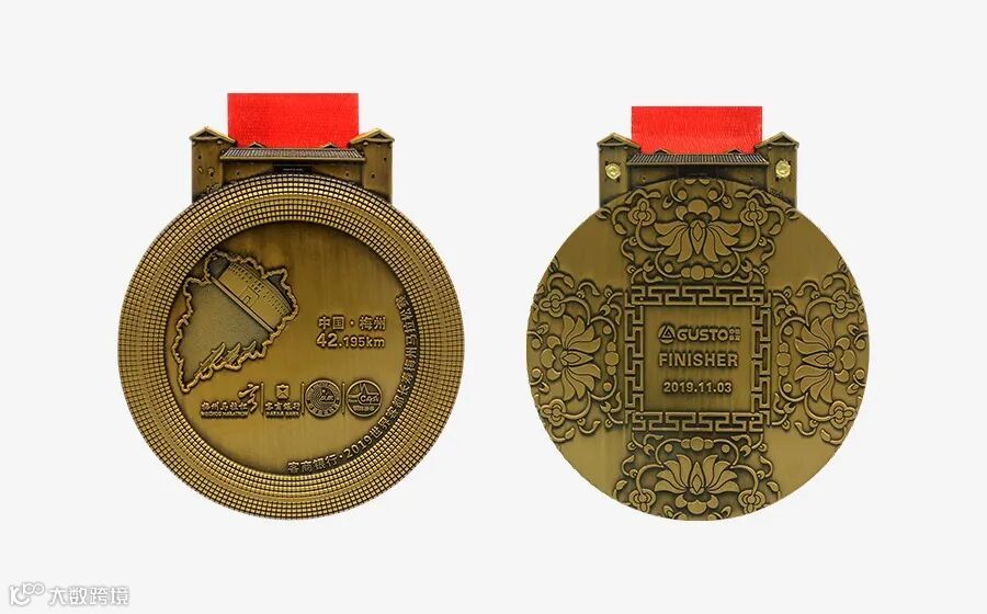2019“梅马”完赛奖牌设计理念为“客家印记”,外环的花纹取自客家传统围龙屋样式,采用镂空分层设计,共分三层,其中中间层可以旋转。奖牌正面图案为梅州现代地标建筑,镂空图案为梅州市地图。当中间层旋转时,可以在镂空区域依次呈现围龙屋、灵光寺、千佛塔和叶剑英纪念园的图案。奖牌背面图案则为客家传统图案美化,整体设计呈现了浓郁的梅州文化历史特色。