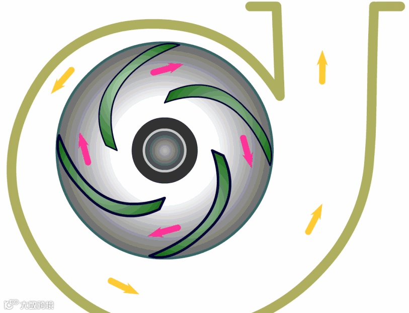 在蜗形泵壳中由于流道的不断扩大,液体的流速减慢,使大部分动能转化为压力能。最后液体以较高的静压强从排出口流入排出管道。