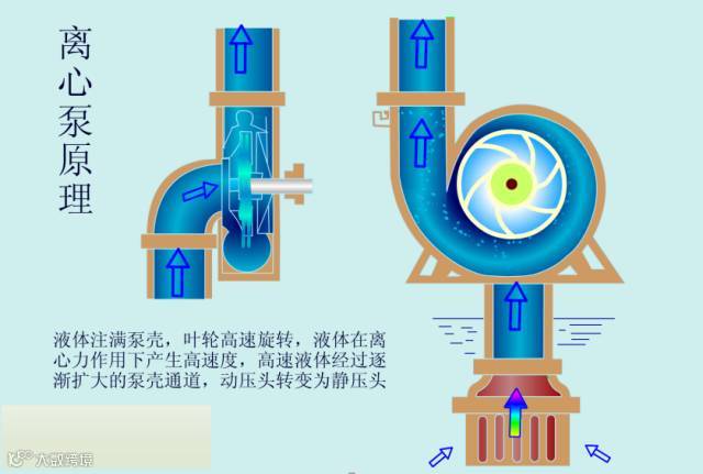 开泵后,泵轴带动叶轮一起高速旋转产生离心力。液体在此作用下,从叶轮中心被抛向叶轮外周,压力增高,并以很高的速度(15-25 m/s)流入泵壳。
