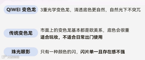 【优点】:QIWEI幻彩调色眼影,底色更自然清透,自然光下不突兀。相对更适合日常,适用场景也更广。