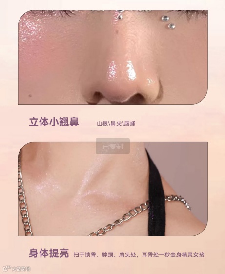 适用范围:立体翘鼻、颧骨提亮、眼周局部点缀、锁骨提亮