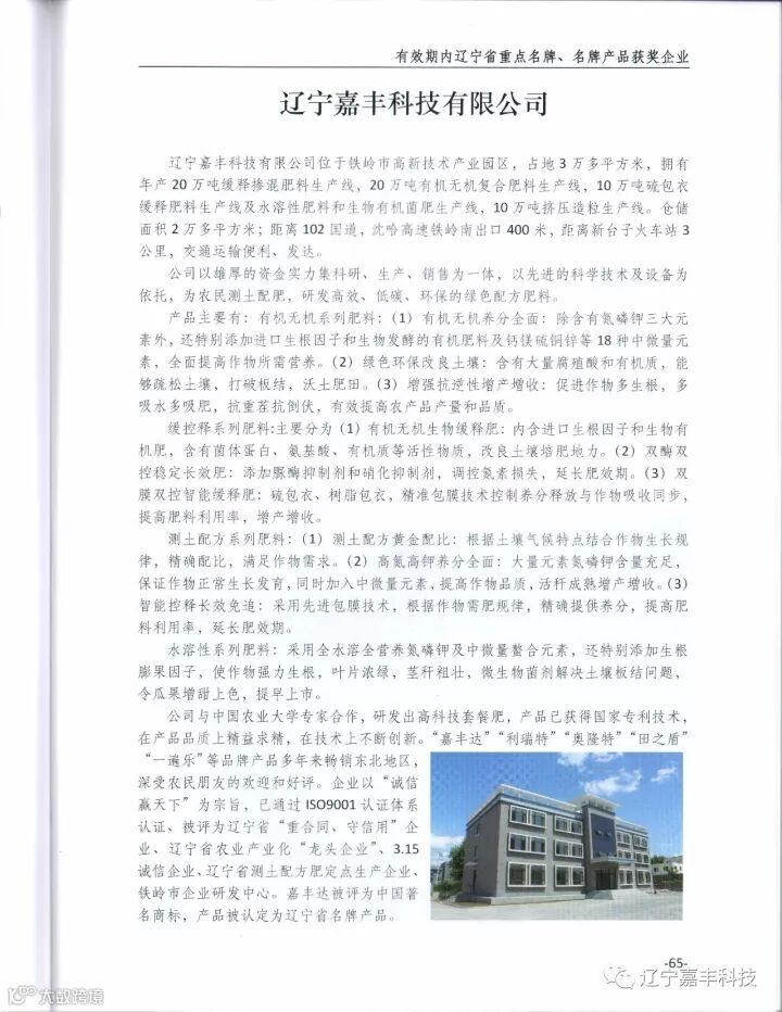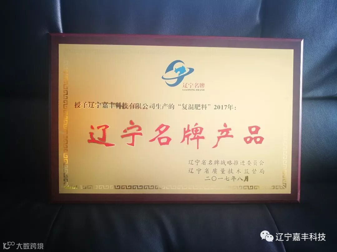 2017年,辽宁嘉丰科技有限公司荣获辽宁省名牌产品,这是对辽宁嘉丰科技有限公司十几年来如一日坚持“质量第一”为原则的一种肯定,也是对“嘉丰达”品牌产品质量的认定和保护。今后,辽宁嘉丰科技有限公司将继续传承“质量至上”的理念,用心做好肥料,坚持种地养地相结合,造功能肥,做功德事,为还子孙后代可持续耕种的土地而贡献自己的一份力量!