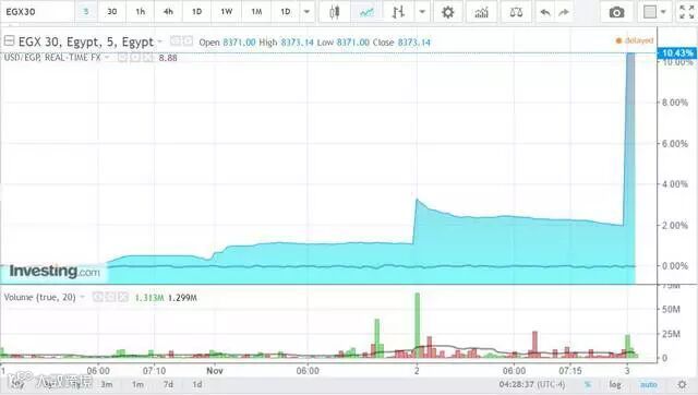 11月3日,埃及央行宣布允许汇率自由浮动,埃及镑兑美元将一次性贬值至13,此前为8.8;同时加息300个基点。此举宣布后,埃及股指EGX 30指数大涨逾10%,创2008年以来最大涨幅。