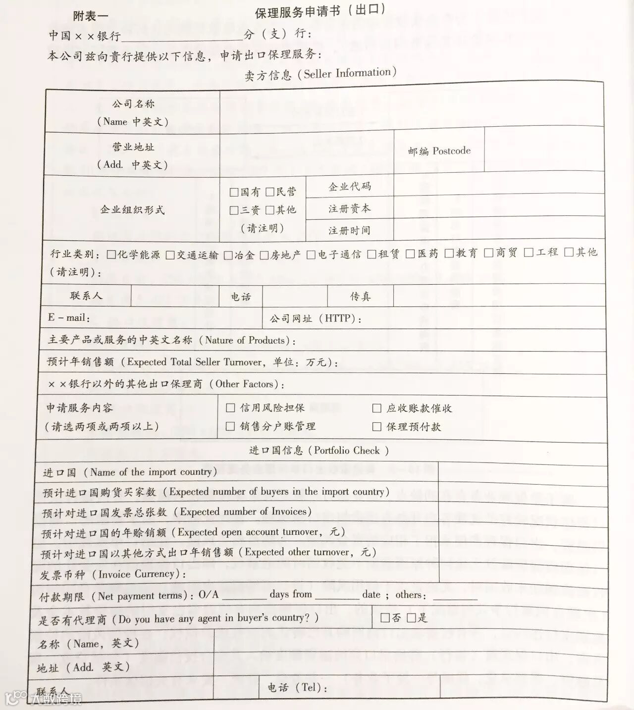 出口商向出口保理商提出叙做国际保理的申请(见附表一),出口商可以将全部债务人信息提供给出口保理商,也可以提供部分债务人的信息。一般还需要提供销售或服务合同。