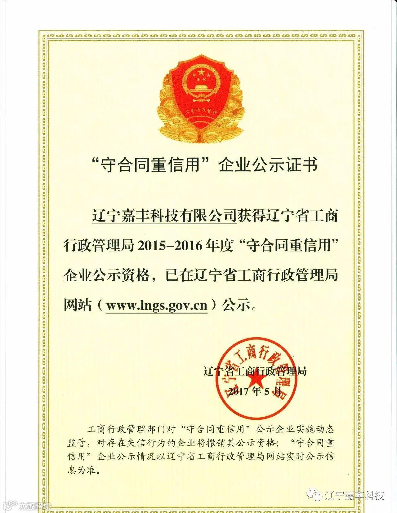 2013-2014年度,辽宁嘉丰科技有限公司获得铁岭市“守合同重信用”企业,在此基础上,公司领导更加把规范合同管理作为“守合同重信用”的一个极为重要的环节,把合同管理视为企业的生命和财富,把诚实守信作为企业发展之本。经过全体嘉丰人的不懈追求和努力,2015-2016年度,我们再次荣获“守合同重信用”企业荣誉称号,获批省级“守合同重信用”企业公示。