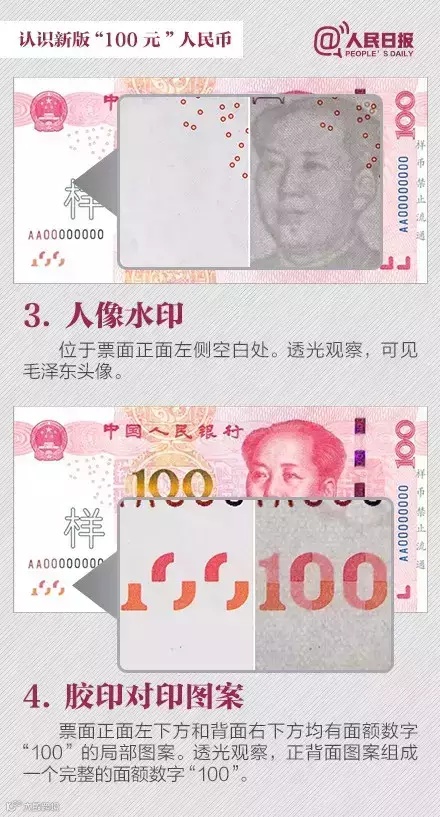 ④对光看,正面左下角和背面右下角图案形成完整“100”… …