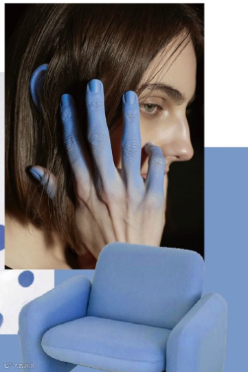 辅色运用时,可利用形态丰富的波点纹样、同色系不同深浅度的搭配,通过光影变化,映射罗比亚蓝的艺术质感。