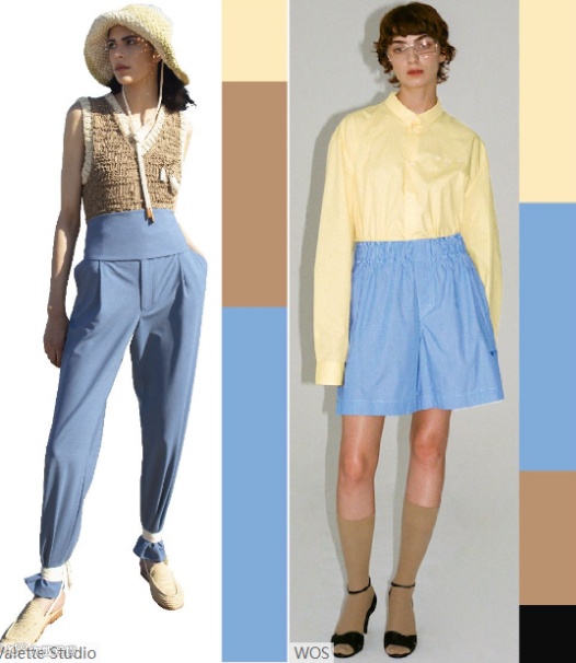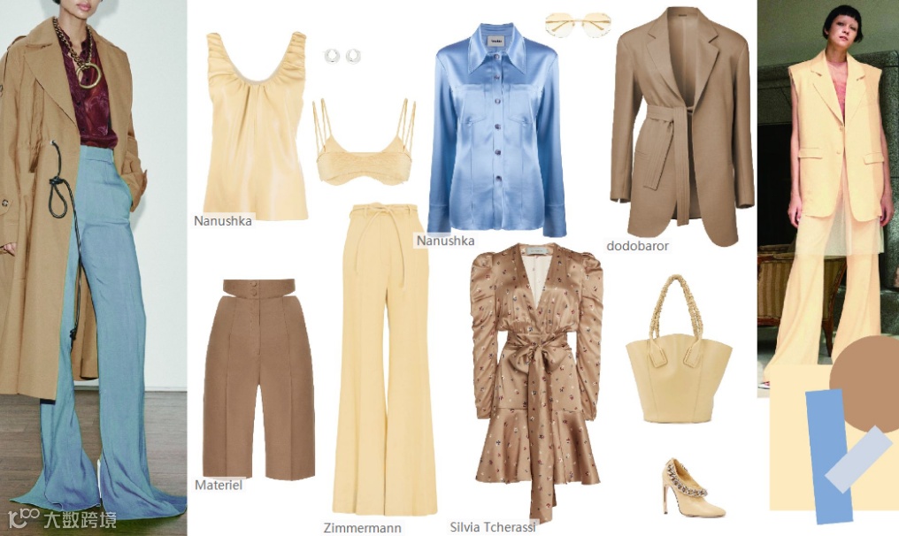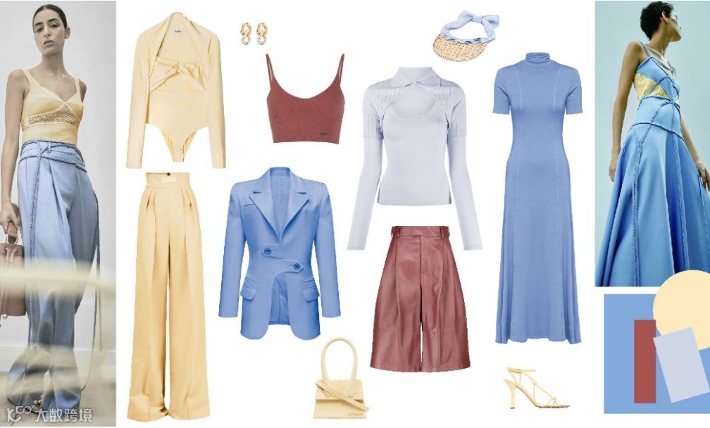 作为辅色的罗比亚蓝以裤装或配饰的方式呈现简约休闲的视觉效果,推动随性夏季着装风格。杏子冰淇淋色作为主色用简洁有力的线条感带来大气且温暖的治愈,给消费者带来天然舒适的时尚质感。