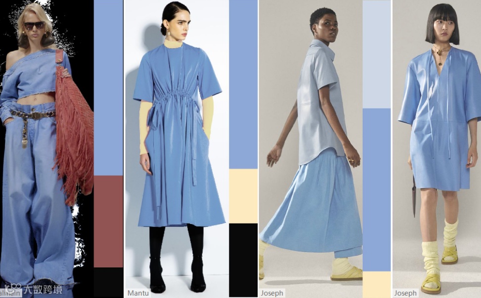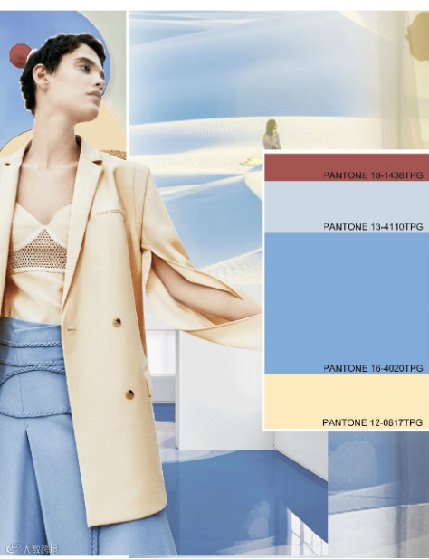 以罗比亚蓝为主的单品呈现自然极简的风格,皮革的应用也不再是秋冬的专用面料,皮具感的北极冰和罗比亚蓝在春夏季更适合超轻的环保材质,是都市女性生活中必备的时尚元素。杏子冰淇淋色作为内搭或饰品融合整组色调,搭配出日常高级美学。