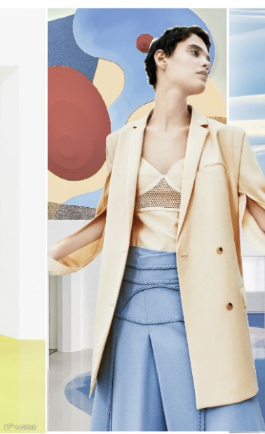 夏日色盘,灵感源自法国画家昆汀·蒙格的多彩作品,通过夸张线条的大面积色块,将杏子冰淇淋的主调性运用于整组系列的套装及内搭单品设计,并搭配罗比亚蓝、鹿棕的简约衬衫和外套,散发出夏日能量和艺术气息。