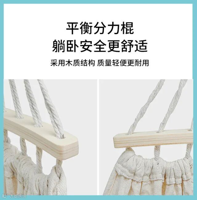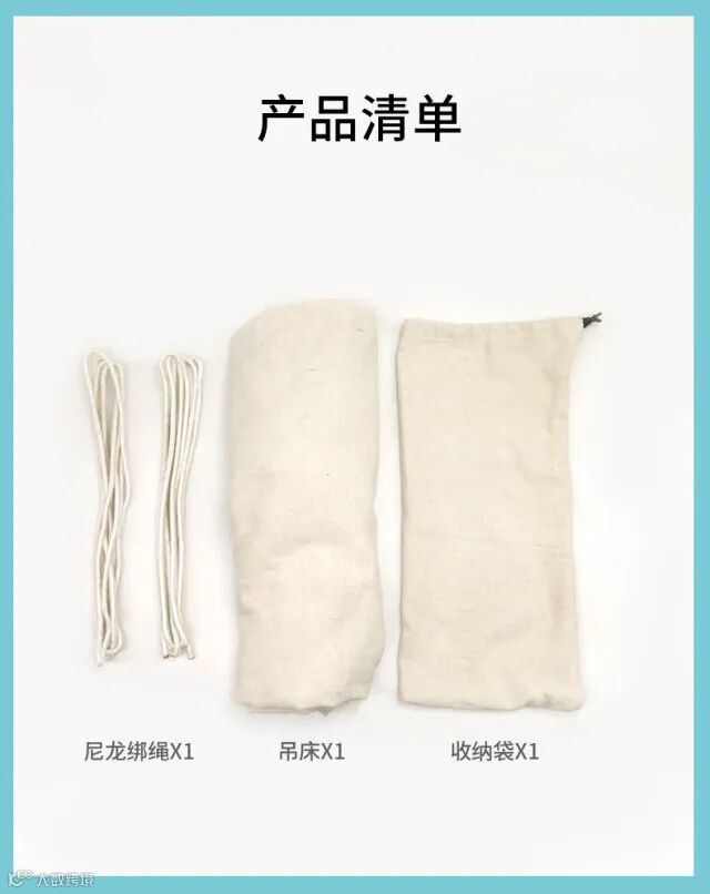 【产品清单】:吊床x1条,尼龙绑绳x2根,收纳布袋x1个。