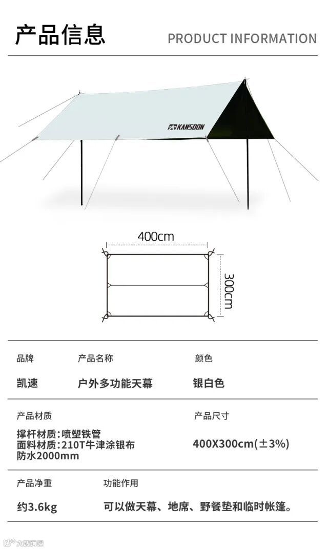 【户外用品】凯速户外多功能天幕4*3m 银白色 TM02