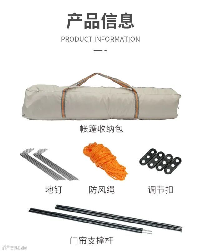 【产品清单】:幕布收纳袋x1 ,钢管收纳袋x1, 幕布x1 ,钢管x8, 地钉x8, 防风绳x8根