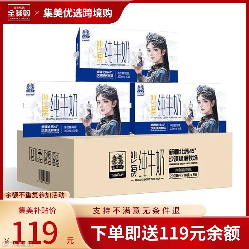 【试吃补贴·限购1箱】新疆土姥姥沙漠纯牛奶(200ml*10盒)*3箱