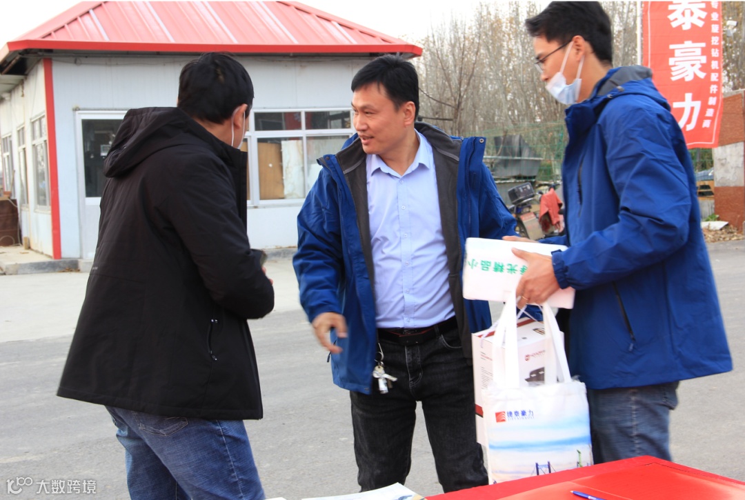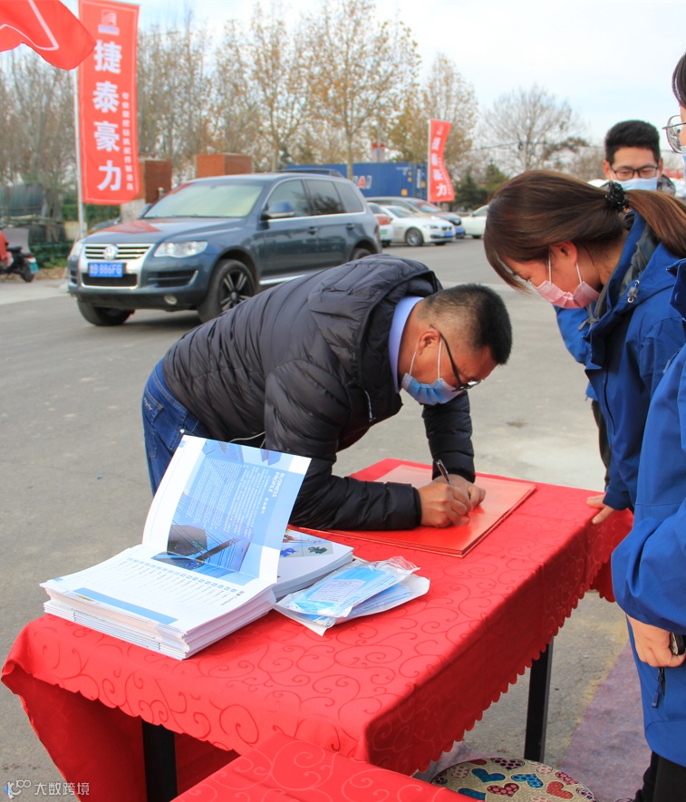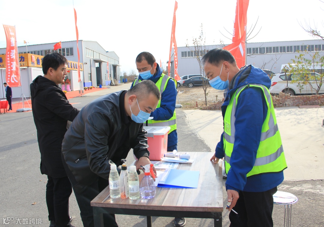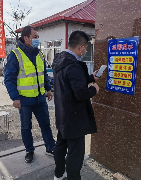 工作人员为来宾查验行程码,签到并发放随手礼。