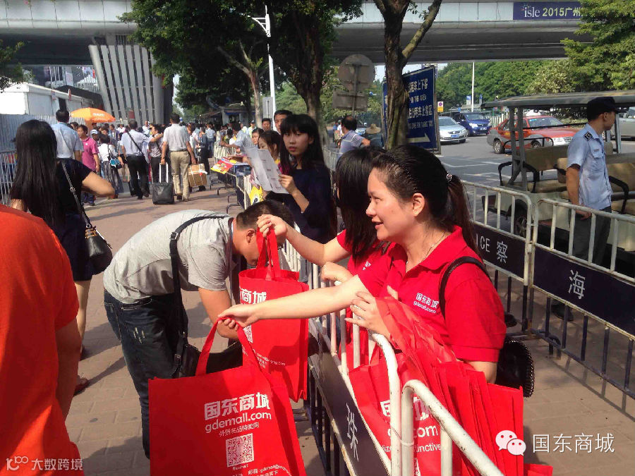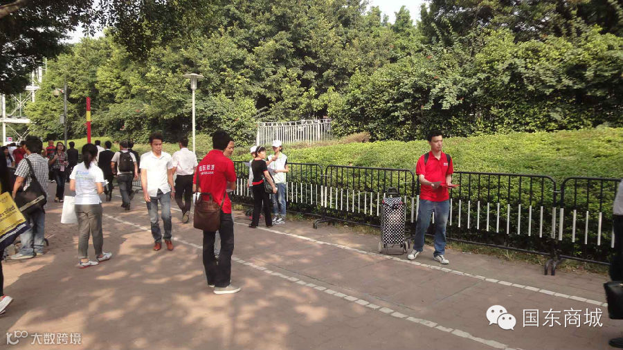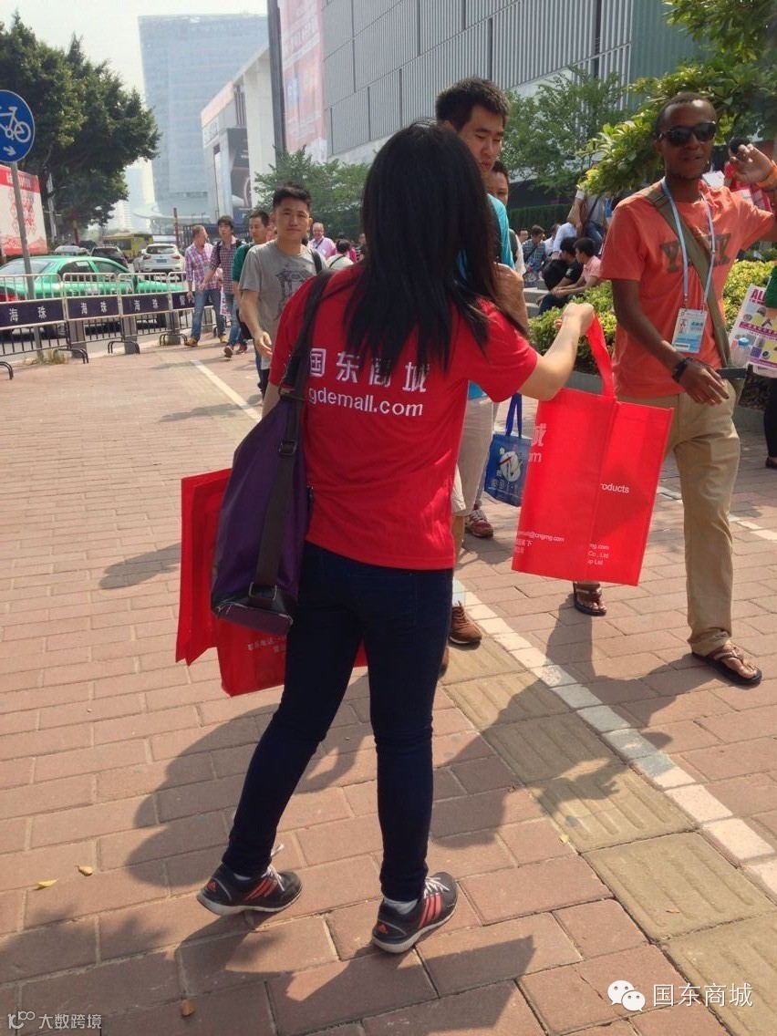 琶洲展馆外,国东商城工作人员穿着特别定制印着国东商城网站的衣服,热情向来往人群派发国东商城宣传资料小册子。