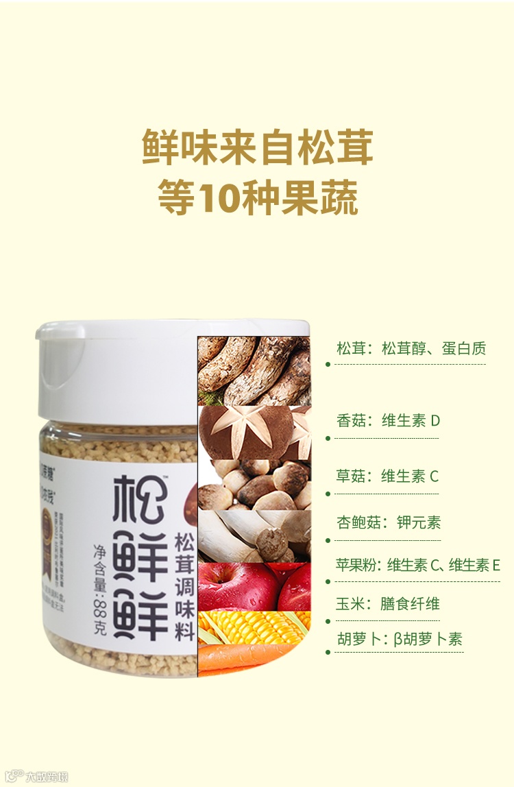 “它是自然的鲜味,配料很干净,特别适合给宝宝辅食做调味,都是大自然中的天然食材!”