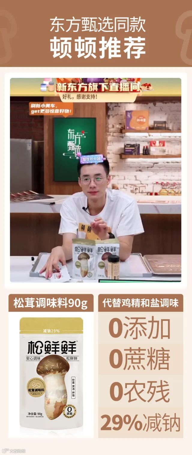 因为0添加,29%减钠,代替鸡精味精调味,在东方甄选的直播间,顿顿老师也觉得我们产品好,对我们0添加调味的产品理念,非常认可!