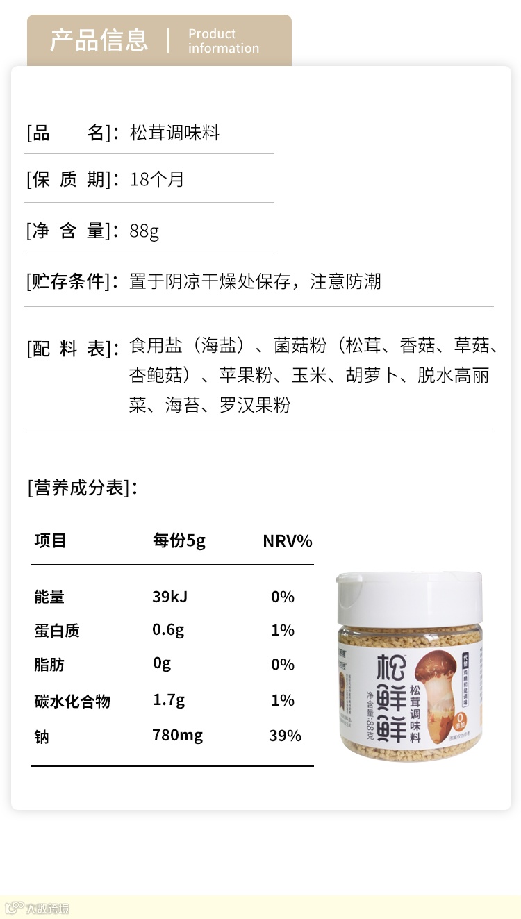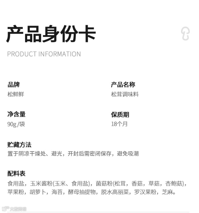 【配料】食用盐,玉米酱粉(玉米、食用盐),菌菇粉(松茸、香菇、草菇、杏鲍菇),苹果粉,胡萝卜,酵母抽提物,脱水高丽菜、罗汉果粉,芝麻