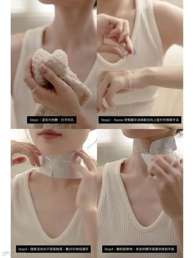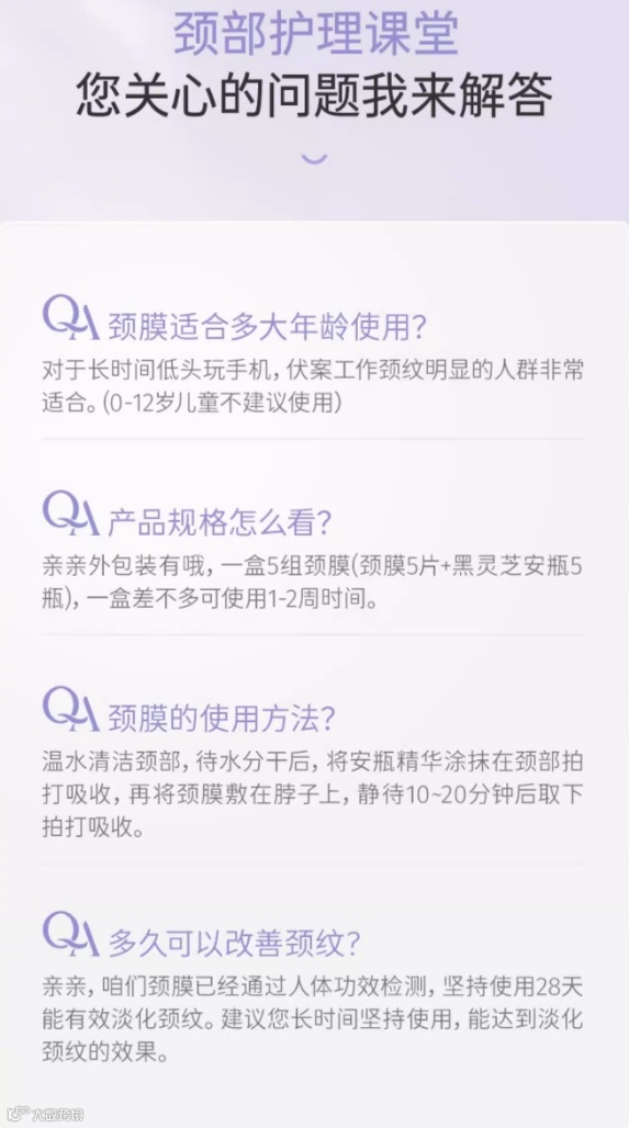 2.淡纹原理:四大通路五大专利通过先补水保湿(透明质酸专利),解决颈部干燥问题;再均匀颈部肤色(珍稀黑灵芝精华抗氧化)改善色素沉淀导致的暗沉:最后提拉紧致(五重胜肽专利),最终有效淡化颈纹