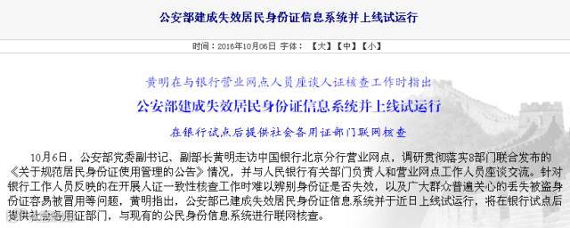 10月6日上午,公安部副部长黄明走访中国银行营业网点时透露一个重要信息:公安部已建成失效居民身份证信息系统并于近日上线试运行!这意味着,身份证报失后将即时失效,无法继续使用。