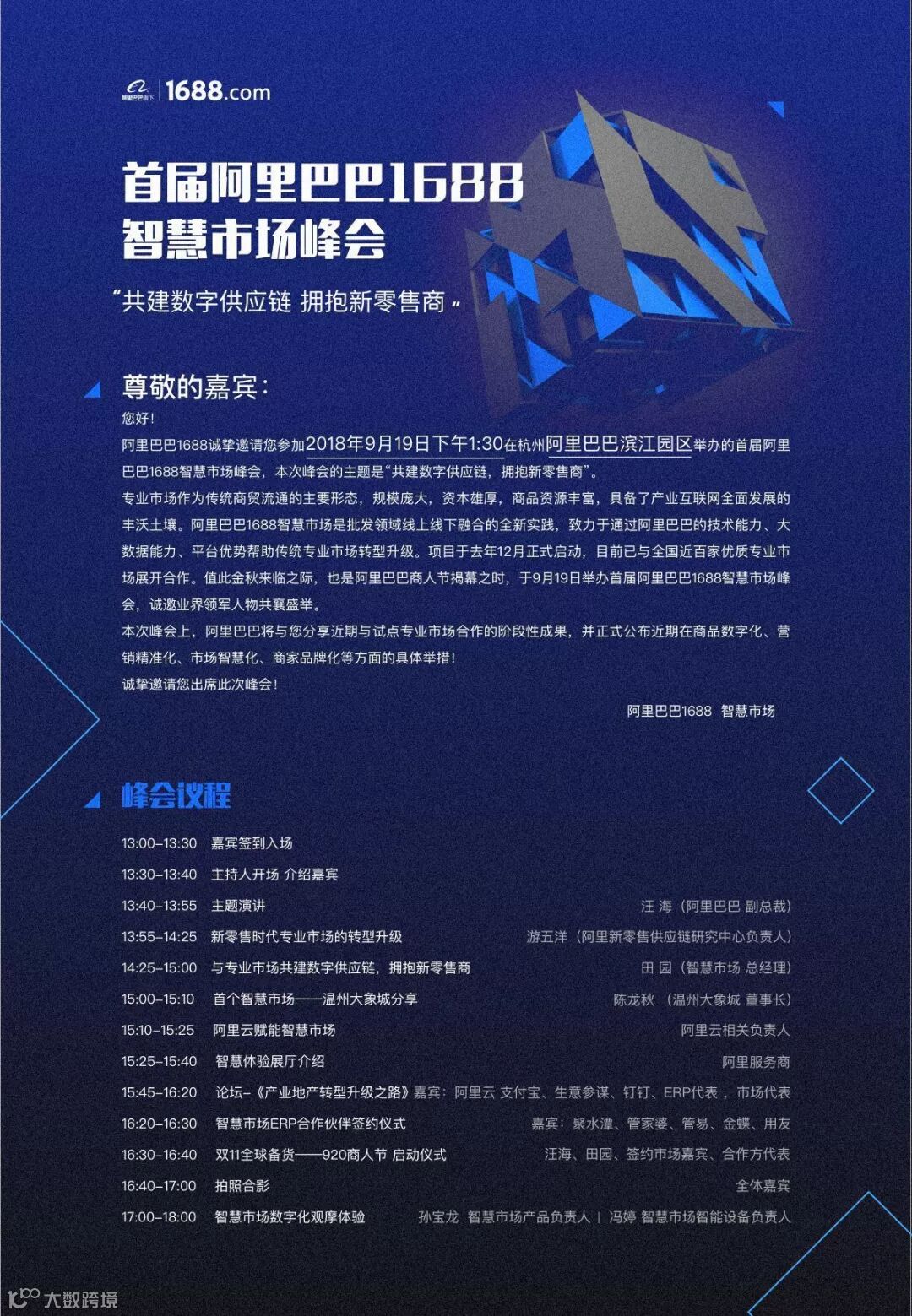 首届阿里巴巴1688智慧市场峰会于2018年9月19日下午在杭州阿里巴巴滨江园区举办,峰会的主题是“共建数字供应链,拥抱新零售商”。