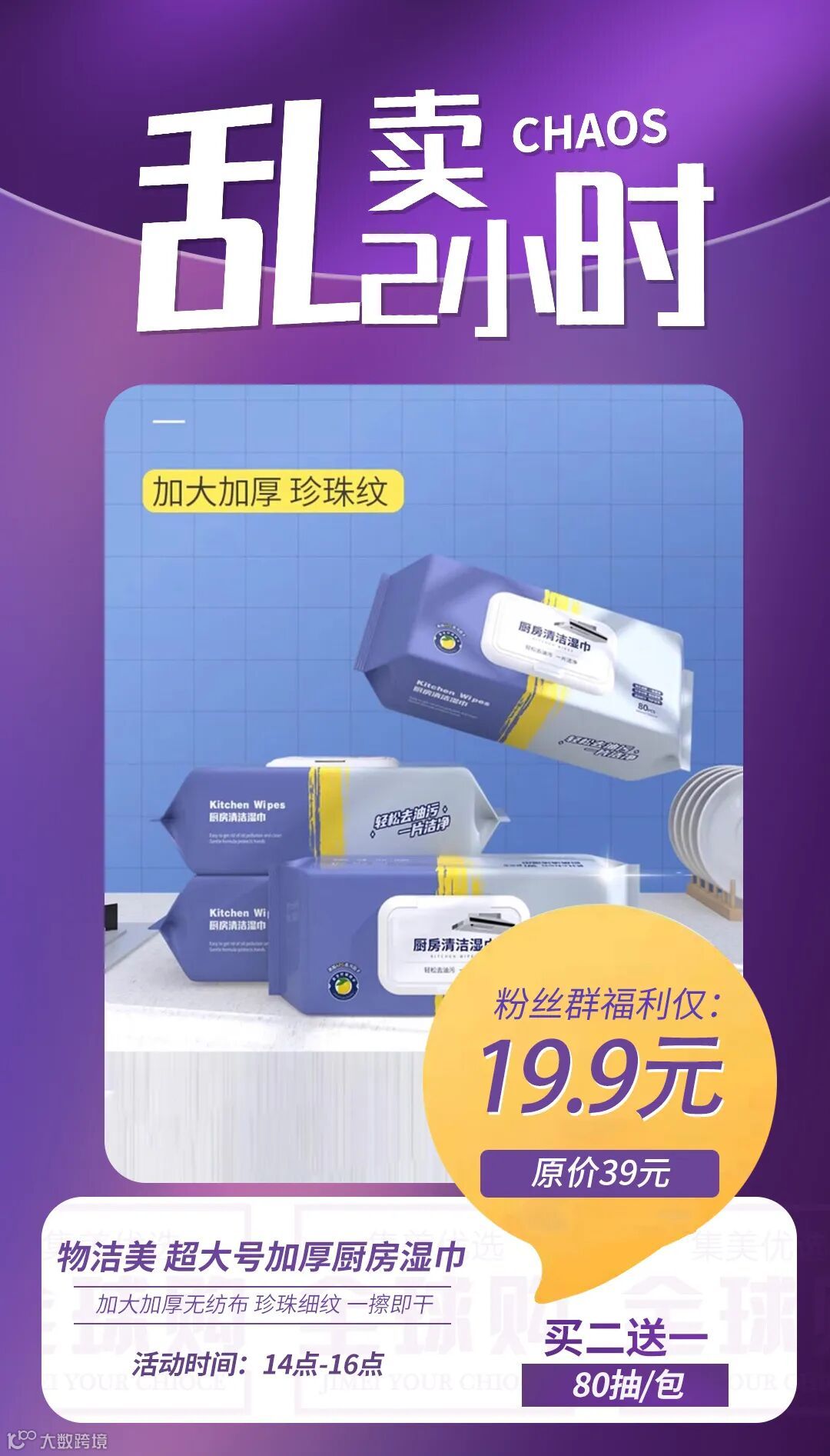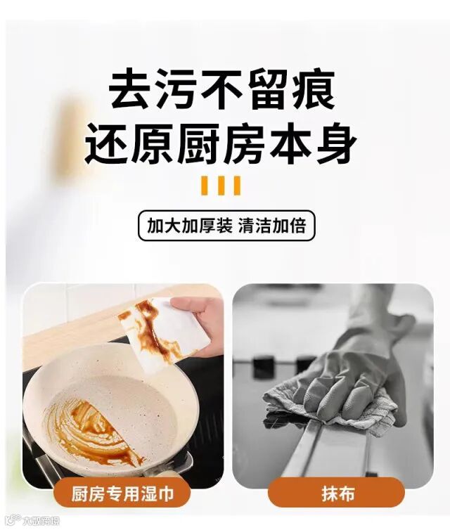 【乱卖2小时·买二送一】物洁美 厨房湿巾厨房去污去油湿巾80抽/包 20Cm×25cm 原价:39元 粉丝群补贴价:19.9元