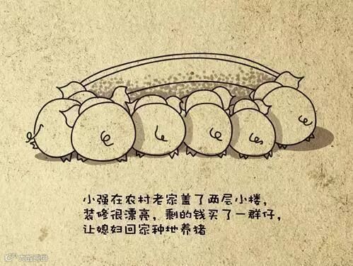 小强在农村老家盖了两层小楼,装修很漂亮,剩的钱买了一群仔,让媳妇回家种地养猪。