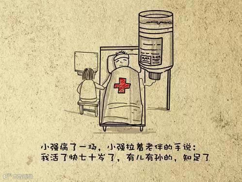 小强病了一场,小强拉着老伴的手说:我活了快七十岁了,有儿有孙的,知足了。