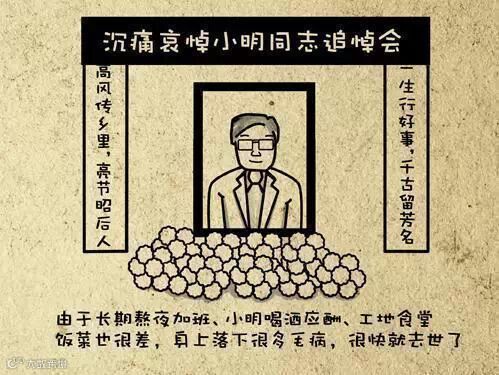 由于长期的熬夜加班,小明喝酒应酬、工地食堂饭菜也很差,身上落下很多毛病,很快就去世了。